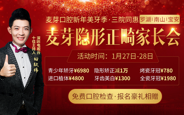 为让更多的人体验隐形矫牙,麦芽口腔联合多家隐形矫牙材料厂商将于1月27号下午开展"如隐随型 麦芽隐形正畸家长会",仅当天享隐形矫正减免1万。麦芽口腔一城三院,罗湖、南山、宝安三机构,将同时举办,您可以就近选择参与活动。届时将邀请国际隐形矫正双认证医师为孩子和家长详细解答各种口腔正畸疑难问题,并为提前预约的歪牙市民进行联合会诊,还有现场精致的茶歇,抽大奖等,另外还有矫牙真人案例现身分享矫牙心得。精彩不断,敬请期待!